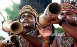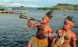 Penari dari Kampung Ayapo meniup terompet tradisional ame dalam acara pembukaan Pagelaran Budaya Nusantara di Pantai Khalkote, Distrik Sentani Timur, Kabupaten Jayapura, Papua, Kamis (28/7/2022). Sejumlah penari dari Kampung Ayapo membawakan Tari Akhokoy di Festival Nusantara, Tari Akhokoy yang berasal dari Kampung Adat Yokiwa di tepi Danau Sentani tersebut memiliki makna mengangkat kebesaran sosok Ondoafi atau Sang Kepala Adat yang dihormati rakyatnya dan mencerminkan kerukunan tiga suku penghuni Yokiwa, antara lain Suku Awoitauw, Suku Fiobetauw, serta Suku Mimitauw.  (FOTO : ANTARA/Gusti Tanati)