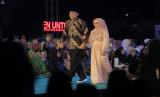 Wali Kota Surabaya Eri Cahyadi dan Isteri Rini Indrayani memperagakan busana rancangan Ning Ficky dan Listya saat Kick Off Satu Abad Nahdlatul Ulama (NU) di Surabaya, Jawa Timur, Kamis (28/7/2022). Kick Off Satu Abad NU yang diisi dengan berbagai acara seperti Tugu Pahlawan Fashion Night, kesenian Ishari, pembacaan puisi dan kesenian lainnya tersebut mengusung tema Harmoni, Kkolaborasi dan Inovasi. (FOTO : ANTARA/Moch Asim)