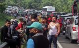Wisatawan keluar dari kendaraan saat menunggu antrean panjang kendaraan menuju kawasan wisata Puncak, Gadog, Kabupaten Bogor, Jawa Barat, Sabtu (30/7/2022). Sat Lantas Polres Bogor memberlakukan sistem buka tutup jalur untuk mengurai kepadatan kendaraan di jalur Puncak Bogor imbas tingginya antusiasme warga untuk berlibur di kawasan tersebut pada libur Tahun Baru Islam 1 Muharam 1444 Hijriyah. (FOTO : ANTARA/Yulius Satria Wijaya)