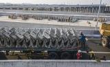 Sejumlah pekerja menyusun barrier beton di pembangunan Jalan Tol Cibitung-Cilincing (JTCC) seksi 3 di Tarumajaya, Kabupaten Bekasi, Jawa Barat, Jumat (29/7/2022). JTCC Seksi 2 dan 3 segmen Telaga Asih-Gabus, Muara Bakti-Kanal Banjir Timur sepanjang 24,65 km akan beroperasi serta menjadi akses alternatif dari kawasan industri Bekasi menuju Pelabuhan Tanjung Priok.  (FOTO : ANTARA/Fakhri Hermansyah)