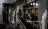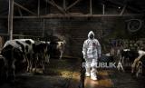 Petugas dari Dinas Ketahanan Pangan dan Pertanian (DKPP) Kota Bandung berjalan di area kandang hewan ternak di Jalan Raden Ganda, Kecamatan Cicendo, Kota Bandung, Senin (1/8/2022). Pemerintah Kota Bandung menerima bantuan 400 dosis yang diperuntukkan untuk vaksinasi penyakit mulut kuku (PMK) tahap kedua guna mengantisipasi serta mengendalikan penyebaran PMK di Kota Bandung. (FOTO : REPUBLIKA/ABDAN SYAKURA)