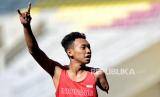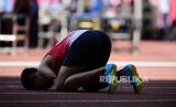 Pelari Indonesia Firza Faturahman Listianto melakukan sujud sukur seusai melintasi garis finish pada babak final lari 100 meter putra klasifikasi T46 Asean Paragames 2022 di Stadion Manahan, Solo, Jawa Tengah, Senin (1/8/2022).  (FOTO : Republika/Thoudy Badai)