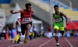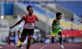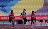 Pelari Indonesia Firza Faturahman Listianto memacu kecepatan pada babak final lari 100 meter putra klasifikasi T46 Asean Paragames 2022 di Stadion Manahan, Solo, Jawa Tengah, Senin (1/8/2022). Firza berhasil meraih medali emas di nomor lari 100 meter putra T46 dan medali perak diraih oleh Phung Dinh Tu dari Vietnam. Lalu, wakil lain dari Vietnam, Pham Xuan Huy, mendapat medali perunggu.  (FOTO : Republika/Thoudy Badai)