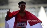Pelari Indonesia Firza Faturahman Listianto melakukan selebrasi dengan membawa bendera Merah Putih usai berhasil menang pada babak final lari 100 meter putra klasifikasi T46 Asean Paragames 2022 di Stadion Manahan, Solo, Jawa Tengah, Senin (1/8/2022). Firza berhasil meraih medali emas di nomor lari 100 meter putra T46 dan medali perak diraih oleh Phung Dinh Tu dari Vietnam. Lalu, wakil lain dari Vietnam, Pham Xuan Huy, mendapat medali perunggu. (FOTO : Republika/Thoudy Badai)