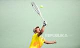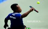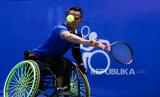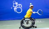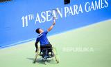 Petenis Indonesia Madhusen mengembalikan bola kepada petenis Thailand Pol Janteam pada pertandingan tenis kursi roda Asean Para Games 2022 di UTP Sport Center, Solo, Jawa Tengah, Selasa (2/7/2022). Madhusen berhasil menang atas Pol Janteam dengan skor 2-1. (FOTO : Republika/Thoudy Badai)