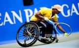 Petenis Thailand Pol Janteam mengembalikan bola kepada petenis Indonesia Madhusen pada pertandingan tenis kursi roda Asean Para Games 2022 di UTP Sport Center, Solo, Jawa Tengah, Selasa (2/7/2022). Madhusen berhasil menang atas Pol Janteam dengan skor 2-1. (FOTO : Republika/Thoudy Badai)