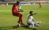 Penyerang Timnas Indonesia U16 Nabil Asyura menahan bola dari gelandang Timnas Singapura U16 Muhammad Ramli pada lanjutan penyisihan grup A AFF U16 Putra 2022 di Stadion Maguwoharjo, Sleman, Yogyakarta, Rabu (3/8/2022). Pada babak pertama pertandingan ini Timnas Indonesia U16 unggul 6-0 atas Timnas Singapura U16. (FOTO : Republika/Wihdan Hidayat)