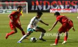 Gelandang Timnas Indonesia U16 Komang Putra ditahan dua pemain Timnas Singapura U16 pada pertandingan lanjutan penyisihan grup A AFF U16 Putra 2022 di Stadion Maguwoharjo, Sleman, Yogyakarta, Rabu (3/8/2022). Pada pertandingan ini Timnas Indonesia U16 berhasil pecundangi Timnas Singapura U16 dengan skor 9-0. (FOTO : Republika/Wihdan Hidayat)