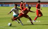 Gelandang Timnas Indonesia U16 Komang Putra dihadang bek Timnas Singapura U16 Heng Wei Xian pada pertandingan lanjutan penyisihan grup A AFF U16 Putra 2022 di Stadion Maguwoharjo, Sleman, Yogyakarta, Rabu (3/8/2022). Pada pertandingan ini Timnas Indonesia U16 berhasil pecundangi Timnas Singapura U16 dengan skor 9-0. (FOTO : Republika/Wihdan Hidayat)