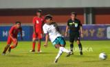 Gelandang Timnas Indonesia U16 Kafiatur Rizky menembak bola ke gawang Timnas Singapura U16 pada lanjutan penyisihan grup A AFF U16 Putra 2022 di Stadion Maguwoharjo, Sleman, Yogyakarta, Rabu (3/8/2022). Pada pertandingan ini Timnas Indonesia U16 mempecundangi Timnas Singapura U16 dengan skor 9-0. (FOTO : Republika/Wihdan Hidayat)