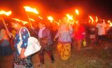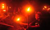 Warga berjalan dengan membawa obor saat mengikuti tradisi Lamporan di Desa Kedumulyo, Sukolilo, Pati, Jawa Tengah, Rabu (3/8/2022). Selain sebagai ungkapan syukur petani kepada Tuhan YME atas panen yang melimpah, tradisi yang digelar pada bulan Sura tersebut sebagai simbol untuk mengusir malapetaka atau tolak bala hama pertanian. (FOTO : ANTARA/Yusuf Nugroho)
