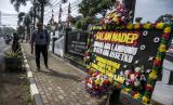 Warga melintas di dekat karangan bunga yang berisi tuntutan dan kecaman terhadap Doni Salmanan saat sidang perdana penipuan investasi opsi biner dengan terdakwa Doni M Taufik alias Doni Salmanan di Pengadilan Negeri Bale Bandung Kelas 1A, Jalan Jaksa Naranata, Baleendah, Kabupaten Bandung, Kamis (4/8/2022). Dalam sidang perdana yang beragendakan pembacaan dakwaan tersebut, Jaksa Penuntut Umum (JPU) mendakwa Doni Salmanan telah melakukan penipuan berkedok investasi opsi biner dengan mengajak para korban bermain investasi di platform Quotex serta. JPU mencatat ada sebanyak 142 orang yang menjadi korban penipuan dengan kerugian mencapai Rp24,3 miliar. (FOTO : REPUBLIKA/ABDAN SYAKURA)