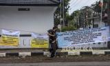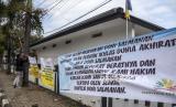 Warga memasang spanduk tuntutan dan kecaman terhadap Doni Salmanan saat sidang perdana penipuan investasi opsi biner dengan terdakwa Doni M Taufik alias Doni Salmanan di Pengadilan Negeri Bale Bandung Kelas 1A, Jalan Jaksa Naranata, Baleendah, Kabupaten Bandung, Kamis (4/8/2022). Dalam sidang perdana yang beragendakan pembacaan dakwaan tersebut, Jaksa Penuntut Umum (JPU) mendakwa Doni Salmanan telah melakukan penipuan berkedok investasi opsi biner dengan mengajak para korban bermain investasi di platform Quotex serta. JPU mencatat ada sebanyak 142 orang yang menjadi korban penipuan dengan kerugian mencapai Rp24,3 miliar. (FOTO : REPUBLIKA/ABDAN SYAKURA)