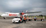 Pesawat jenis ATR-72 milik Wings Air bersiap parkir saat uji coba operasional penerbangan komersil di Bandara Pondok Cabe, Tangerang Selatan, Banten, Kamis (4/8/2022). Mulai 5 Agustus 2022 Bandara Pondok Cabe (PCB) akan melayani penerbangan komersil atau penerbangan penumpang berjadwal yang akan dilayani oleh maskapai Wings Air dengan tujuan Purbalingga, Cepu Blora, Sumenep Madura, Lubuk Linggau, Ketapang Pontianak dan Krui Lampung. (FOTO : ANTARA/Muhammad Iqbal)