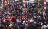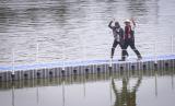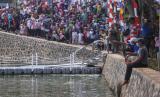 REPUBLIKA.CO.ID,DEPOK -- Gubernur Jawa Barat Ridwan Kamil berjalan bersama Bonge di atas floating brigde saat peresmian Situ Rawa Kalong di Curug, Depok, Jawa Barat, Jumat (5/8/2022).