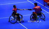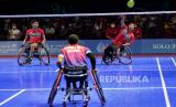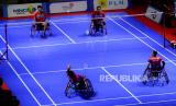 REPUBLIKA.CO.ID,SOLO -- Pasangan pebulu tangkis Indonesia Agung Widodo (kanan) dan Supriadi berusaha mengembalikan kok ke arah pasangan Malaysia Muhammad Ikhwan Bin Ramli dan Noor Azwan Bin Noorlan pada final ganda putra WH1-WH2-004 ASEAN Para Games 2022, di Edutorium UMS, Solo, Jawa Tengah, Jumat (5/8/2022).