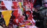 Warga melihat pernak pernik hiasan hari kemerdekaan di Pasar Jatinegara, Jakarta, Sabtu (6/8/2022). Menurut pedagang menjelang perayaan Hari Ulang Tahun (HUT) ke-77 Republik Indonesia penjualan pernak pernik seperti bendera, umbul-umbul dan hiasan bernuansa merah putih tersebut meningkat 20 persen dibandingkan tahun lalu. Republika/Putra M. Akbar (FOTO : Republika/Putra M. Akbar)