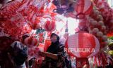 Pedagang menata pernak pernik hiasan hari kemerdekaan di Pasar Jatinegara, Jakarta, Sabtu (6/8/2022). Menurut pedagang menjelang perayaan Hari Ulang Tahun (HUT) ke-77 Republik Indonesia penjualan pernak pernik seperti bendera, umbul-umbul dan hiasan bernuansa merah putih tersebut meningkat 20 persen dibandingkan tahun lalu. (FOTO : Republika/Putra M. Akbar)