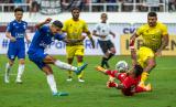 REPUBLIKA.CO.ID,SEMARANG -- Pesepak bola PSIS Semarang Jonathan Cantillana (kedua kiri) melepaskan tembakan ke arah gawang yang dijaga kiper Barito Putera Joko RIbowo (kanan) dalam laga lanjutan BRI Liga 1 di Stadion Jatidiri, Semarang, Jawa Tengah, Sabtu (6/8/2022). PSIS Semarang mengalahkan Barito Putera dengan skor 2-1.