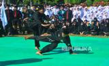 Peserta memperagakan kesenian Pencak Dor saat Kick Off Satu Abad Nahdlatul Ulama (NU) di Kudus, Jawa Tengah, Ahad (7/8/2022). Kegiatan yang diisi dengan berbagai acara seperti apel kebesaran NU, ikrar kebangsaan, bazar UMKM dan halaqoh serta istighosah tersebut mengusung tema Mendigdayakan Nahdlatul Ulama, Menjemput Abad Kedua, Menuju Kebangkitan Baru. (FOTO : ANTARA/Yusuf Nugroho)