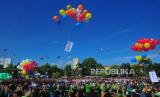 REPUBLIKA.CO.ID, KUDUS -- Peserta melepas balon dan burung merpati sebagai simbol perdamaian saat "Kick Off" Satu Abad Nahdlatul Ulama (NU) di Kudus, Jawa Tengah, Ahad (7/8/2022).