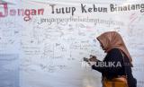 Warga mengenakan kebaya membubuhkan tanda tangan sebagai bentuk dukungan saat Bandung Lautan Kebaya di Bandung Zoological Garden, Kota Bandung, Senin (8/8/2022). Bandung Lautan Kebaya yang diikuti oleh sedikitnya 35 komunitas dari berbagai daerah tersebut digelar dalam rangka pelestarian kebaya sebagai warisan leluhur dan upaya mendaftarkan kebaya ke UNESCO sebagai warisan budaya tak benda asal Indonesia. Selain itu, kegiatan tersebut sebagai upaya dukungan penyelesaian atas polemik kepemilikan lahan kebun binatang bandung (Bandung Zoological Garden). Republika/Abdan Syakura (FOTO : REPUBLIKA/ABDAN SYAKURA)