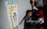 Petugas mengukur tinggi badan anak sebelum disuntikan vaksin campak rubella di kawasan Batu Ampar, Kramat Jati, Jakarta, Selasa (9/8/2022). Layanan jemput bola vaksin campak rubella dalam rangka Bulan Imunisasi Anak Nasional 2022 tersebut sebagai upaya untuk memenuhi target imunisasi sebanyak 715.782 anak-anak berusia 9-59 bulan di wilayah Pemprov DKI Jakarta. Republika/Putra M. Akbar (FOTO : Republika/Putra M. Akbar)