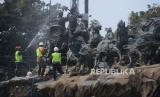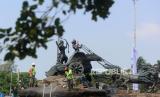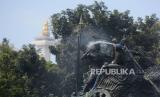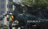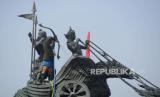 REPUBLIKA.CO.ID,JAKARTA -- Pekerja membersihkan patung Asta Brata (Arjuna Wijaya) di jalan Medan Merdeka Barat, Jakarta, Selasa (9/8/2022).