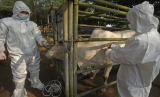 Petugas Kesehatan Hewan DKPP (Dinas Ketahanan Pangan dan Pertanian) Provinsi Banten memeriksa sapi saat pelaksanaan vaksinasi penyakit mulut dan kuku (PMK) dosis kedua di Curug, Serang, Banten, Selasa (9/8/2022). DKPP Provinsi Banten mulai melakukan vaksinasi PMK Dosis kedua dengan menyuntikkan 4.400 dosis vaksin dengan prioritas untuk ternak yang telah mendapat vaksin dosis pertama. (FOTO : ANTARA/Asep Fathulrahman)