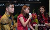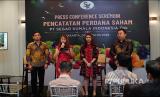 Direktur Utama PT Segar Kumala Indonesia Tbk. Renny Laurend (tengah) menjawab pertanyaan wartawan pada acara listing PT Segar Kumala Indonesia Tbk. (BUAH) di Bursa Efek Indonesia Jakarta, Selasa, 9/8/2022. BUAH melepas 200 Juta lembar saham dengan harga Rp388 per saham dan menjadi emiten ke-41 yang listing sepanjang 2022 dan ke-807 di Bursa Efek Indonesia (BEI). (FOTO : Dok )