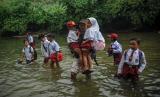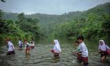 REPUBLIKA.CO.ID,CIANJUR -- Sejumlah siswa menyeberangi Sungai Ciujung untuk sekolah di Desa Sukaluyu, Cikadu, Cianjur Selatan, Kabupaten Cianjur, Jawa Barat, Rabu (10/8/2022).