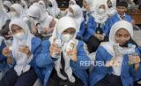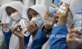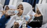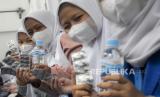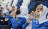 Sejumlah siswi meminum tablet tambah darah (TTD) saat kegiatan gebyar minum tablet tambah darah (TTD) serentak di Gedung Sate, Jalan Diponegoro, Kota Bandung, Kamis (11/8/2022). Kegiatan yang digelar bertepatan dengan Hari Remaja Internasional tersebut bertujuan untuk mengejar target cakupan remaja putri yang mendapatkan TTD sesuai di Jawa Barat sebesar 52 persen, sekaligus upaya untuk menurunkan kasus anemia pada remaja putri dan pencegahan stunting. Republika/Abdan Syakura (FOTO : REPUBLIKA/ABDAN SYAKURA)