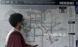 Penumpang melihat peta rute bus Transjakarta di Halte Cakra Selaras Wahana (CSW), Kebayoran Baru, Jakarta, Kamis (11/8/2022). Gubernur DKI Jakarta Anies Baswedan menetapkan tarif integrasi untuk layanan transportasi umum massal yakni Transjakarta, MRT dan LRT dengan tarif maksimum dalam satu kali perjalanan sebesar Rp 10.000. (FOTO : Republika/Putra M. Akbar)