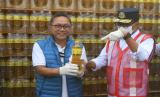 REPUBLIKA.CO.ID, JAKARTA -- Menteri Perdagangan Zulkifli Hasan (kiri) bersama Menteri Perhubungan Budi Karya Sumadi (kanan) menunjukkan minyak goreng Minyakita sebelum di kirim ke Indonesia bagian timur di Pelabuhan Tanjung Priok, Jakarta, Kamis (11/8/2022).