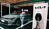 Model berpose di dekat mobil listrik KIA Niro EV yang di pamerkan pada pameran otomotif Gaikindo Indonesia International Auto Show (GIIAS) 2022 di ICE BSD, Tangerang, Banten, Kamis (11/8/2022). Sebanyak 25 merek kendaraan menghadirkan jajaran kendaraan listriknya pada ajang pameran otomotif GIIAS 2022. (FOTO : ANTARA/Hafidz Mubarak A)
