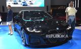 Model berpose di dekat mobil listrik BMW The i4 yang di pamerkan pada pameran otomotif Gaikindo Indonesia International Auto Show (GIIAS) 2022 di ICE BSD, Tangerang, Banten, Kamis (11/8/2022). Sebanyak 25 merek kendaraan menghadirkan jajaran kendaraan listriknya pada ajang pameran otomotif GIIAS 2022. (FOTO : ANTARA/Hafidz Mubarak A)