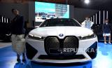 Model berpose di dekat mobil listrik BMW The iX yang di pamerkan pada pameran otomotif Gaikindo Indonesia International Auto Show (GIIAS) 2022 di ICE BSD, Tangerang, Banten, Kamis (11/8/2022). Sebanyak 25 merek kendaraan menghadirkan jajaran kendaraan listriknya pada ajang pameran otomotif GIIAS 2022. (FOTO : ANTARA/Hafidz Mubarak A)