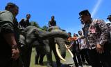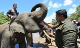 REPUBLIKA.CO.ID, ACEH JAYA -- Sejumlah warga berada di dekat gajah Sumatra (Elephas maximus sumatranus) jinak saat peringatan Hari Gajah Sedunia di Conservation Respon Unit (CRU) Sampoiniet, Aceh Jaya, Aceh, Kamis (11/8/2022).