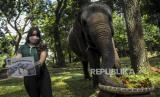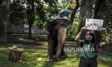 Petugas memegang poster peringatan Hari Gajah Sedunia 2022 di Bandung Zoological Garden, Kota Bandung, Jumat (12/8/2022). Peringatan Hari Gajah Sedunia yang dirayakan setiap 12 Agustus tersebut menjadi upaya menyebarkan kesadaran tentang pelestarian dan perlindungan satwa yang semakin berkurang populasinya di alam liar akibat konflik dengan manusia, perambahan hutan dan perburuan. Republika/Abdan Syakura (FOTO : REPUBLIKA/ABDAN SYAKURA)