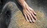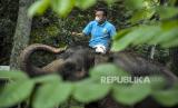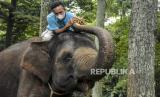 Pawang satwa mengelus gajah sumatra (Elephas maximus sumatrensis) saat peringatan Hari Gajah Sedunia 2022 di Bandung Zoological Garden, Kota Bandung, Jumat (12/8/2022). Peringatan Hari Gajah Sedunia yang dirayakan setiap 12 Agustus tersebut menjadi upaya menyebarkan kesadaran tentang pelestarian dan perlindungan satwa yang semakin berkurang populasinya di alam liar akibat konflik dengan manusia, perambahan hutan dan perburuan. Republika/Abdan Syakura (FOTO : REPUBLIKA/ABDAN SYAKURA)