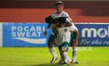 Gelandang Timnas U16 Indonesia Kafiatur Rizky melakukan selebrasi bersama Kaka Purwanto dan Nabil Asyura usai mencetak gol ke gawang Timnas U16 Vietnam saat Final Piala AFF U16 Putra di Stadion Maguwoharjo, Sleman, Yogyakarta, Jumat (12/8/2022). Pada pertandingan Final AFF U16 Putra 2022 Timnas U16 Indonesia menjadi juara usai mengalahkan Timnas U16 Vietnam 1-0. Gol semata wayang dicetak oleh Kafiatur Rizky. (FOTO : Republika/Wihdan Hidayat)