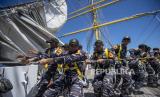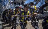 REPUBLIKA.CO.ID, SULAWESI --Taruna Akademi Angkatan Laut (AAL) Tingkat III Angkatan ke-69 menarik tali saat latihan praktek peran layar Kartika Jala Krida (KJK) 2022 di Perairan Sulawesi, Sulawesi Utara, Kamis (11/8/2022).