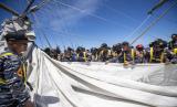 Taruna Akademi Angkatan Laut (AAL) Tingkat III Angkatan ke-69 melipat layar usai melaksanakan latihan praktek peran layar Kartika Jala Krida (KJK) 2022 di Perairan Sulawesi, Sulawesi Utara, Kamis (11/8/2022).  (FOTO : ANTARA FOTO/Nova Wahyudi/rwa.)