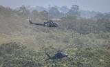 Helikopter Bell 412EPI TNI AD (atas) bersama helikopter Black Hawk US Army saat akan melakukan evakuasi medis dalam puncak latihan bersama (Latma) Super Garuda Shield 2022 di Puslatpur Baturaja, Ogan Komering Ulu (OKU) Timur, Sumatera Selatan, Jumat (12/8/2022). Pelaksanaan puncak latihan  (FOTO : ANTARA/M Risyal Hidayat)