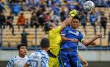 Bek bola Persib Bandung Kakang Rudianto (kanan) berebut bola atas dengan penjaga gawang PSIS Semarang Wahyu Tri (tengah) saat pertandingan BRI Liga 1 di Stadion Gelora Bandung Lautan Api, Bandung, Jawa Barat, Sabtu (13/8/2022). (FOTO : ANTARA/Raisan Al Farisi)