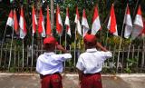 REPUBLIKA.CO.ID, KLATEN -- Dua orang anak hormat kepada Bendera Merah Putih seusai mengikuti kirab dan pemasangan 77 Bendera Merah Putih di Krakitan, Bayat, Klaten, Jawa Tengah, Ahad (14/8/2022).