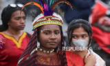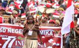 REPUBLIKA.CO.ID,MIMIKA -- Peserta yang mengenakan pakaian adat Papua mengikuti karnaval di Mimika, Papua Tengah, Senin (15/8/2022).
