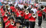 Kelompok Marching Band mengikuti karnaval di Mimika, Papua Tengah, Senin (15/8/2022). Karnaval yang diikuti 120 tim dari berbagai kalangan dengan mengenakan pakaian adat dari sejumlah daerah di Indonesia tersebut untuk meriahkan HUT ke-77 RI. (FOTO : ANTARA/Saldi Hermanto)