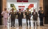 Menteri Pertahanan Prabowo Subianto (ketiga kiri) berfoto bersama Panglima TNI Jenderal TNI Andika Perkasa (keempat kiri), Wamenhan M Herindra (kedua kanan), KASAL Laksamana TNI Yudo Margono (kiri), KASAU Marsekal TNI Fadjar Prasetyo (kanan) dan KASAD Jenderal TNI Dudung Abdurachman (kedua kiri) usai mengikuti acara Penyematan Bintang Kehormatan TNI di Kantor Kemenhan, Jakarta, Senin (15/8/2022). Dalam acara tersebut Menhan Prabowo Subianto menerima empat bintang kehormatan atas jasanya terhadap TNI yaitu Bintang Yudha Dharma Utama dari TNI, Bintang Kartika Eka Pakci Utama dari TNI AD, Bintang Jalasena Utama dari TNI AL dan Bintang Swabhuwana Pakca Utama dari TNI AU. (FOTO : ANTARA/Muhammad Adimaja)