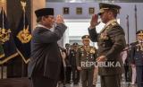 Menteri Pertahanan Prabowo Subianto (kiri) menerima hormat dari Panglima TNI Jenderal TNI Andika Perkasa (kanan) usai menerima Bintang Kehormatan Yudha Dharma Utama pada acara Penyematan Bintang Kehormatan TNI di Kantor Kemenhan, Jakarta, Senin (15/8/2022). Dalam acara tersebut Menhan Prabowo Subianto menerima empat bintang kehormatan atas jasanya terhadap TNI yaitu Bintang Yudha Dharma Utama dari TNI, Bintang Kartika Eka Pakci Utama dari TNI AD, Bintang Jalasena Utama dari TNI AL dan Bintang Swabhuwana Pakca Utama dari TNI AU. (FOTO : ANTARA/Muhammad Adimaja)